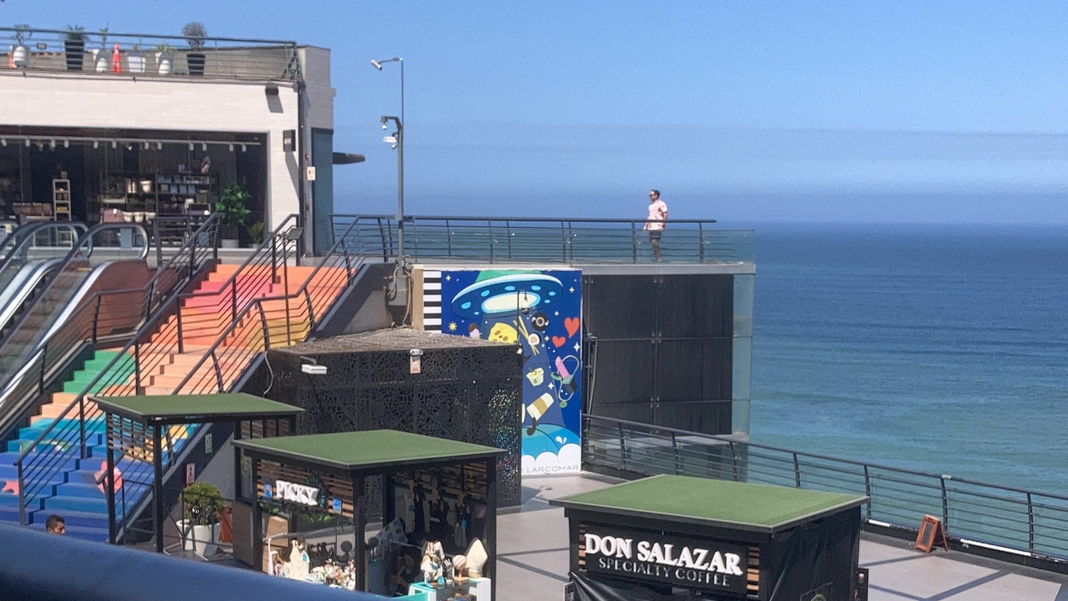 Crossing into Miraflores, the Malecón transforms into a bustling hub, offering parks, gardens, and the iconic Larcomar shopping center with stunning views.